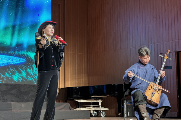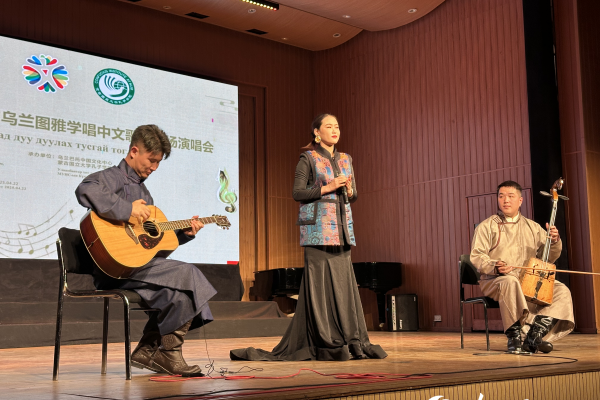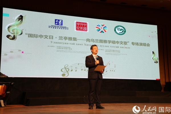 “国际中文日·兰亭雅集——向乌兰图雅学唱中文歌”专场演唱会在蒙古国举办4月22日,“国际中文日·兰亭雅集——向乌兰图雅学唱中文歌”专场演唱会在蒙古国家爱乐乐团演出厅隆重登场。 中国驻蒙古国大使馆参赞兼乌兰巴托中国文化中心主任李峙在致辞中表示,中蒙是山水相连的好邻居、好伙伴。蒙古国越来越多年 轻人把学习中文看作个人成长和通往未来的阶梯,并为推动两国共同发展和友谊贡献智慧的火花。希望通过举办国际中文日和兰亭雅集活动,让蒙古国更多的朋友们与世界人民一道深入了解中国文化,感受彼此心灵的契合。 中国著名歌手乌兰图雅向在场观众演绎了《凤凰飞》《套马杆》《站在草原望北京》《我和草原有个约定》等经典曲目。演出中,乌兰图雅走下舞台,与观众互动,共同放歌,现场气氛热烈、精彩不断。乌兰图雅说:“希望用歌声架起中蒙人民友好的桥梁。也欢迎蒙古国的朋友们多到中国走一走,加强两国民众的相互了解。”来自蒙古国高校、中小学及孔子课堂的老师、同学们也轮番登台。诗朗诵《蜀道难》及《我爱你中国》《精忠报国》等博得阵阵掌声。 本次“国际中文日·兰亭雅集”庆祝活动是全球庆祝国际中文日和兰亭雅集活动的一部分。 图为李峙参赞致辞。