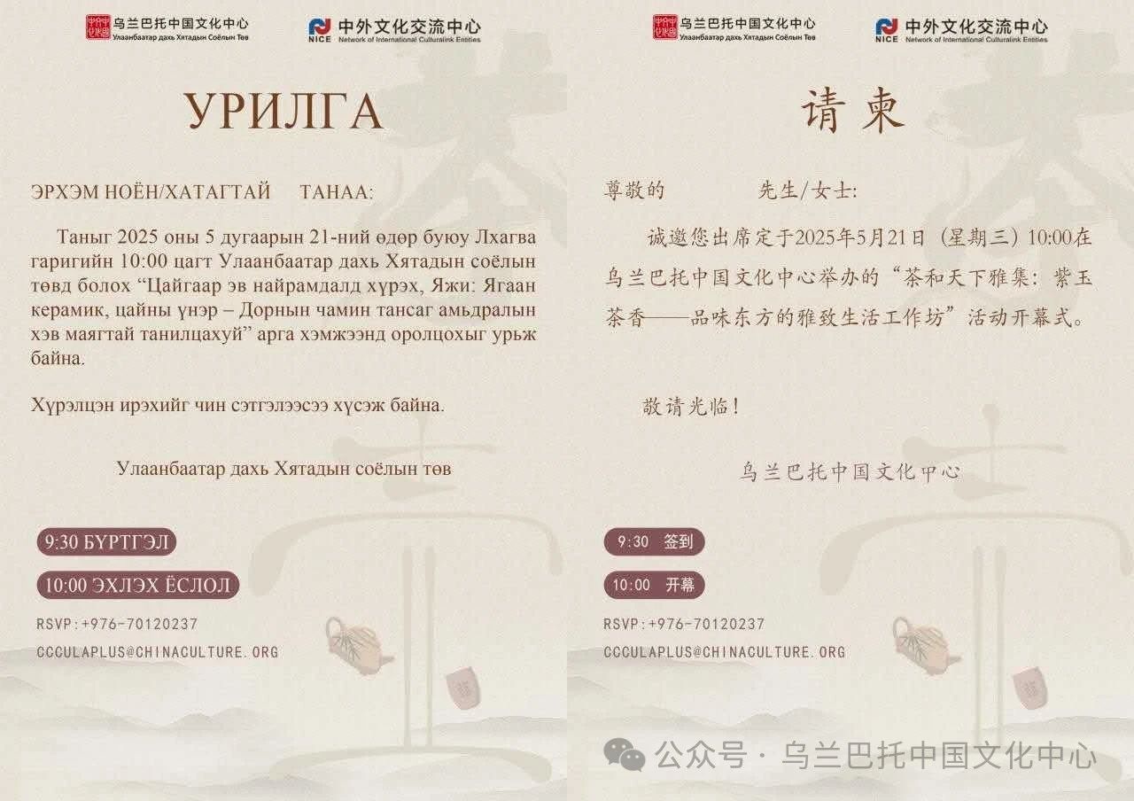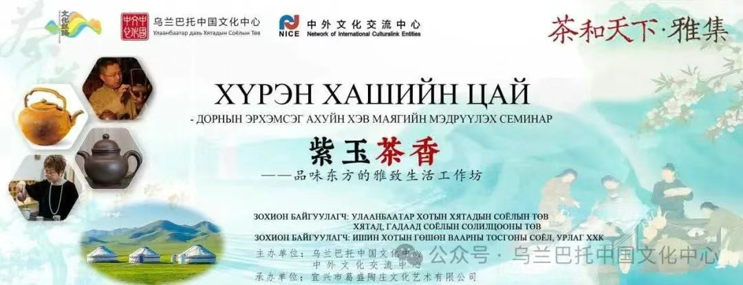 活动亮点: ✅ 沉浸式体验中国茶道之美 ✅ 聆听紫砂艺术的文化与匠心 ✅ 感受东方生活的雅致与宁静 诚邀您的光临! 一同品味茶香,共赏紫砂艺术的千年韵味,开启一段东方美学之旅。 �咨询与报名:乌兰巴托中国文化中心 70120237 #茶和天下#紫砂艺术#东方雅集#中国文化 �一盏茶,一方器,一份悠然心境� 期待与您相遇在这场文化盛宴!