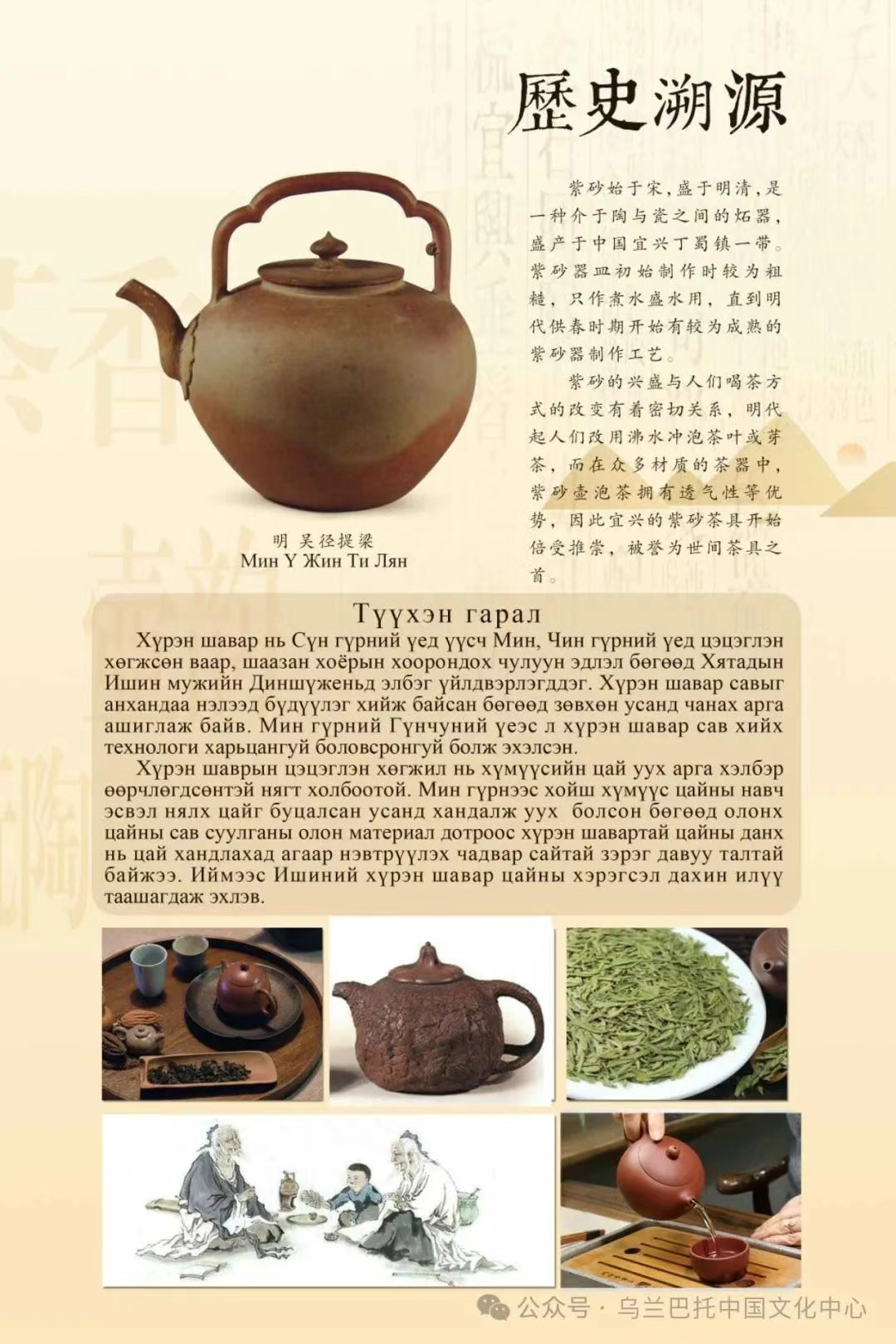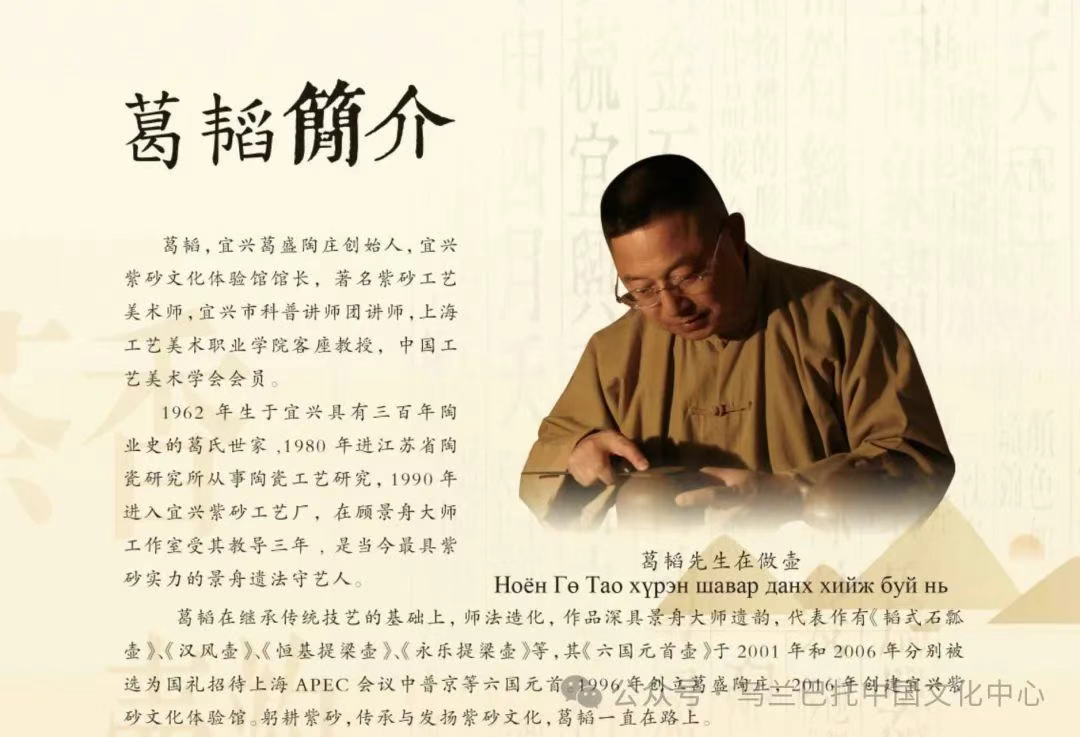 喝茶不可不知紫砂陶——紫玉茶香·品味东方雅致生活工作坊即将开幕2025年5月21日,乌兰巴托中国文化中心将举办“茶和天下雅集:紫玉茶香——品味东方的雅致生活工作坊”开幕式暨 “紫玉茶香”紫砂艺术讲座(主讲人:葛韬)。