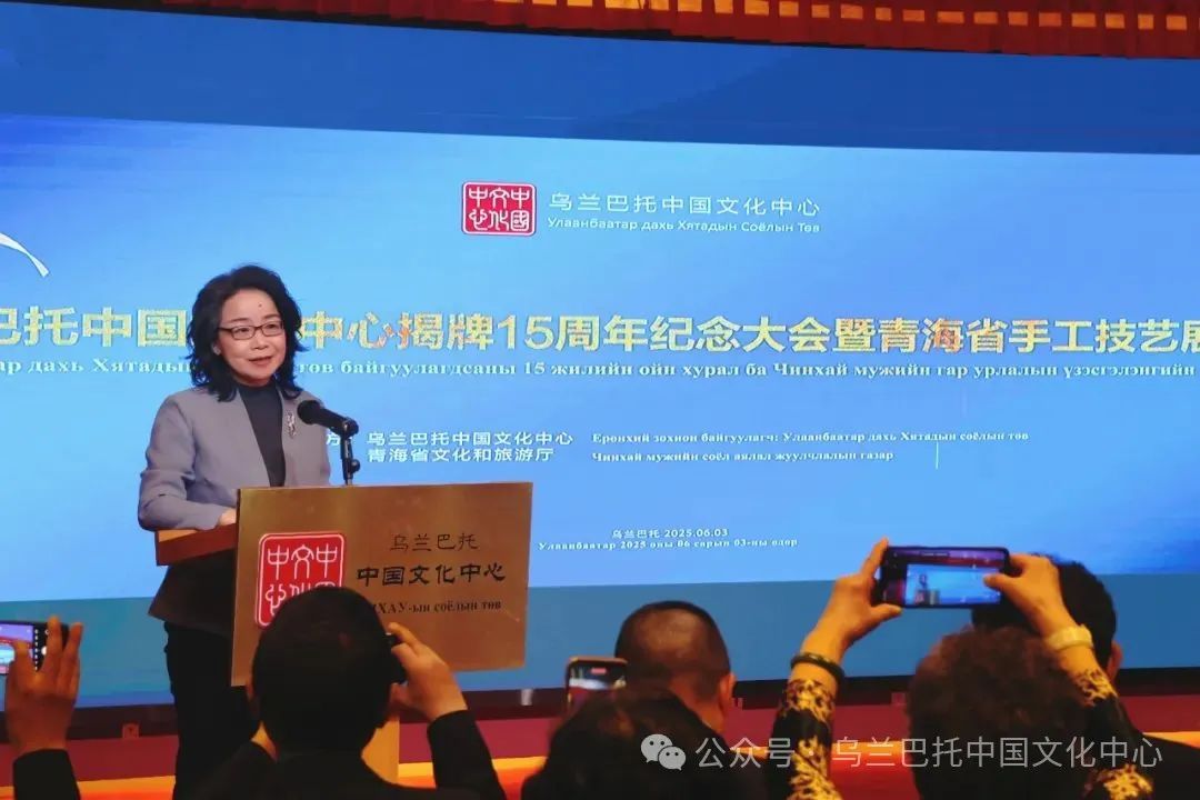 6月3日,乌兰巴托中国文化中心隆重举办乌兰巴托中国文化中心揭牌15周年纪念大会暨青海省手工技艺展开幕式。中国驻蒙古国大使沈敏娟、蒙古国副总理顾问钢包勒德、中国驻蒙古国大使馆参赞兼乌兰巴托中国文化中心主任李峙、蒙中友协主席巴特苏赫、蒙古国文体旅青部文化艺术政策实施协调司司长斯日古楞、青海省文化和旅游厅副厅长常红安、蒙古国外交部邻国局副局长巴特玛格奈及蒙古各界友好人士近百人出席活动并祝贺中心成立15周年。