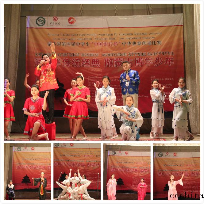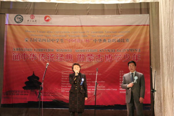 中心主任李薇参赞出席蒙古国第四届中学生中华典籍朗诵比赛11月29日,蒙古国第四届中学生中华典籍朗诵比赛在蒙古国儿童创新培养中心的大礼堂举行,本次比赛由孔子学院总部/国家汉办主办,蒙古国立大学孔子学院和蒙古国汉语教师协会承办,中国驻蒙古国大使馆鼎力支持,并得到了中蒙文化教育基金会和中国银行乌兰巴托代表处的友情协助。来自蒙古26所中学的152位选手奉献了70个节目,诵读了包括《诗经》、乐府诗、唐诗、宋词和众多古文等在内的51首中华经典,为莅临比赛现场的500多名观众献上了一场中华文化的视听盛宴。