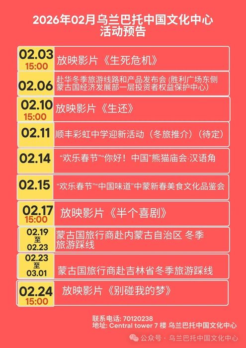 乌兰巴托中国文化中心影片放映预告 кино гаргах зарлал