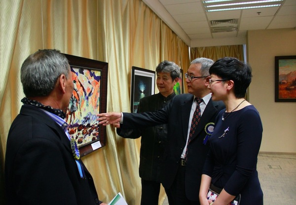 中国驻蒙古国大使馆公参杨庆东与主办方及画家欣赏画作 中华人民共和国驻蒙古国大使馆公使衔参赞杨庆东表示,本次在乌兰巴托中国文化中心展出的艺术作品,从不同侧面向世界展示了异彩纷呈的东方文明,不仅向观众展示了东北亚艺术家独特的艺术成就,带来艺术享受,同时也用艺术的形式诠释了东北亚人民致力于建立包容和谐的相互关系的心愿和努力。相信此次活动将为增进中蒙及其东北亚国家间的文化艺术交流,增进人民之间的相互理解和友谊发挥积极作用。