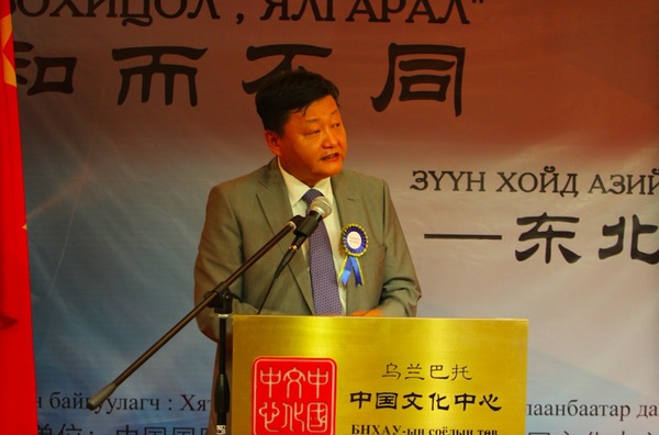 中国国际广播电台东北亚中亚中心副主任张晖致辞 中国国际广播电台东北亚中亚中心的负责人张晖女士表示,媒体是文化交流的渠道、国家对话的平台、民众沟通的窗口。为此,中国国际广播电台发起并举办了“和而不同”系列主题文化活动。希望通过这样的活动能为五国艺术家创造出一种沟通与互动的机会和氛围,让艺术超越国界,得以交融互鉴,并将古老的东方文化通过传承与创新,向全世界传播,并称这是东北亚各国艺术家共同的使命,也是中国国际广播电台和乌兰巴托中国文化中心开办此次展览的宗旨和目标。她还向为此次办展给予大力支持的中国驻蒙古国大使馆、乌兰巴托中国文化中心表示衷心感谢。