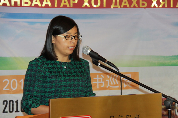 李薇参赞在致辞中表示,书籍是人类知识的宝库,是人类共同的精神财富。此次“2016中国图书巡展”展出了深受蒙古读者欢迎的《习近平谈治国理政》等热点书籍,还有结合乌兰巴托中国文化中心即将举办的“纪念中国文学巨匠汤显祖、英国文学大师莎士比亚逝世400周年”系列活动的《汤显祖戏剧全集》和《莎士比亚全集》等经典图书,本次活动让蒙古国读者近距离感知中华文化的博大精深和世界文化的璀璨美丽,对进一步加深中蒙两国民众间的了解,增进两国文化交流将会起到推动作用。