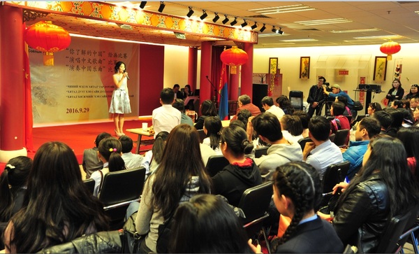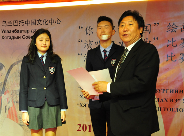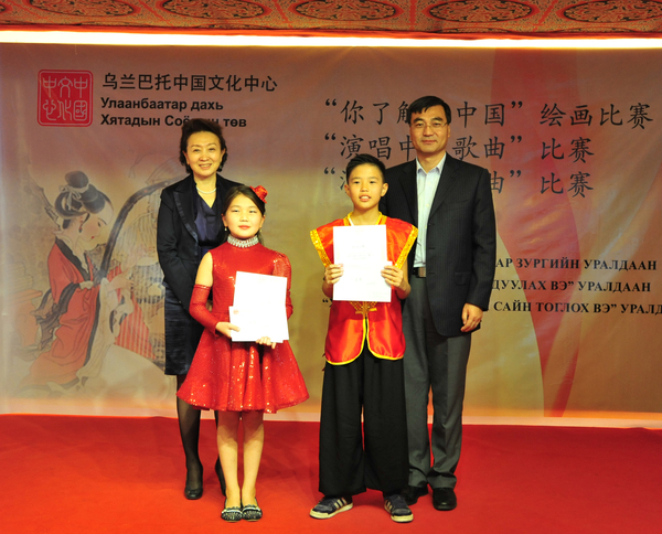 乌兰巴托中国文化中心举办“感知中国” — 中国文化才艺比赛活动9月29日,中华人民共和国成立67周年节日即将来临之际,乌兰巴托中国文化中心组织举办了蒙古国大中小学学生参加的“感知中国”—“你了解的中国”绘画比赛、“演唱中文歌曲”比赛和“演奏中国乐器”比赛活动。旅蒙华侨蒙中友谊学校、育才全日制中文中学、蒙古国立大学、科技大学、人文大学等学校的学习汉语和热爱中国文化的200余名学生报名参加,蒙古国教育文化界人士、学生家长等近100人到现场观看。 活动由乌兰巴托中国文化中心副主任哈斯巴根致开场词,中华人民共和国驻扎门乌德总领事柴文睿、中国驻蒙古大使馆文化参赞兼乌兰巴托中国文化中心主任李薇等出席并向获奖学生颁发奖状和奖金。 整个比赛场面高潮迭起,掌声不断,参赛学生们激情高昂、各显其能,彰显着学生们对中国人文地理、美丽山河、历史文化的各自不同感受和演艺才能,始终洋溢着学习中国文化的浓厚兴趣,充分展示了学生们一直以来努力学习汉语,提高中国知识,了解中国文化的整体水平和现状。蒙古国TV9等电视台进行现场采访和报道。 经过一天的紧张而激烈的角逐,绘画比赛有2名学生获得一等奖,4名学生获得二等奖,6名学生获得三等奖;歌曲比赛有2名学生获得一等奖,3名学生获得二等奖,5名学生获得三等奖;乐器比赛各有1名学生获得一、二、三等奖。 中国文化才艺比赛是乌兰巴托中国文化中心常态化活动之一,蒙古国各级学校师生们十分关注的教学、培训、演出、比赛相结合的活动。